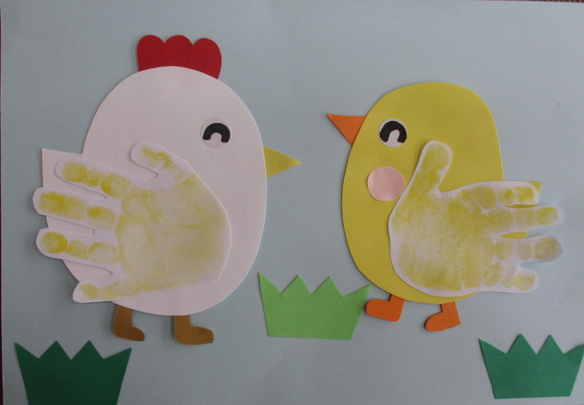 かわいいにわとりさんとひよこさんの親子です。手形で羽を作ってみました。作りに来ませんか!
