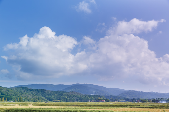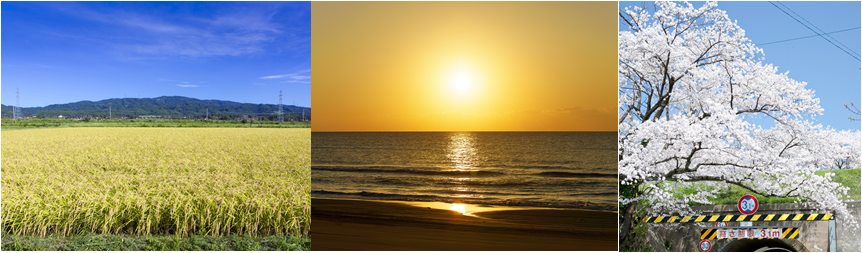 宝達志水町の風景(稲穂が実る田園、夕日が沈む千里浜、天井川付近の桜)